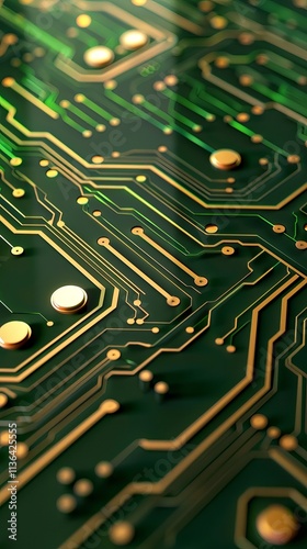 Close-up of a green circuit board featuring intricate gold pathways and components, showcasing modern technology and innovation. circuitboard pattern design wallpaper
