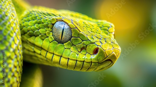 Close-up of a green snake's eye and scales with a blurred green and yellow background.