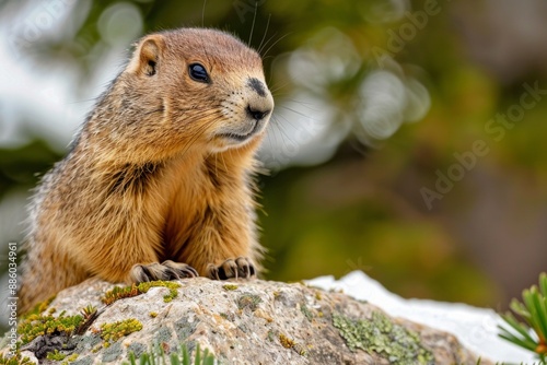 Close-up of a groundhog perched on a mossy rock with a blurred natural background
