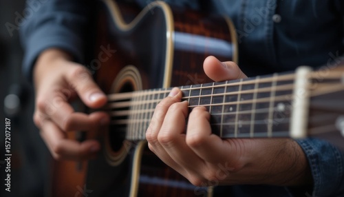 Close-up of a guitar in the hands of a musician. Copy space, 32k Resolution