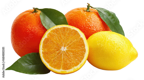 Closeup of a Halved Orange, Whole Orange and Lemon with Green Leaves on Transparent Background