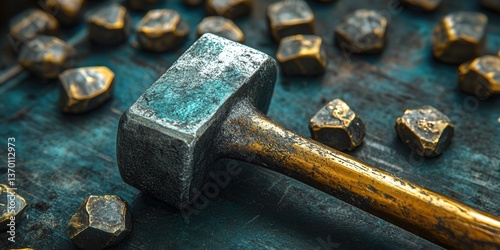 Close-up of a hammer and metallic nuggets on a textured surface.