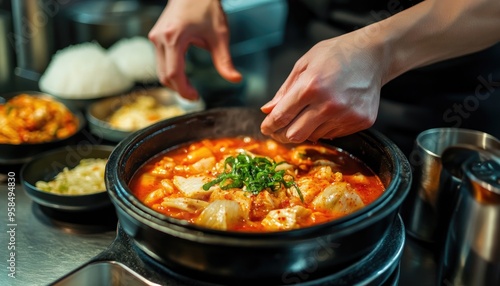 Close-up of a hand adding green onions to a steaming bowl of spicy Korean stew.