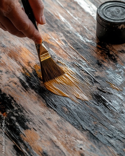 Close-up of a hand applying varnish with a brush on a wooden surface, showcasing texture and craft.