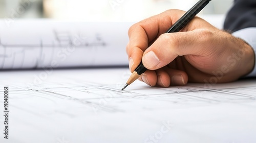Closeup of a hand drawing on a mechanical blueprint, precise drafting lines