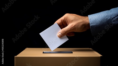 Close-up of a hand dropping a ballot into a voting box, voting, civic participation.
