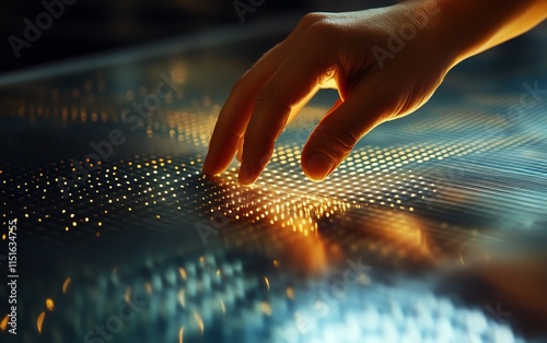 Closeup of a hand gently touching a solar panel, reflecting green energy technology and the shift towards clean, renewable power sources for a sustainable future