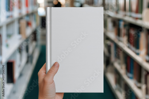 Close-up of a hand holding a blank book inside a library, with shelves full of books in the background. Perfect for book-related or educational themes.
