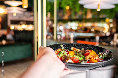 Close-up of a hand holding a colorful salad on a black plate in a restaurant setting