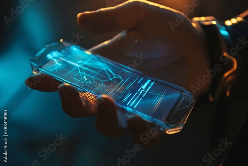 Close-up of a hand holding a futuristic phone of the future with a holographic display
