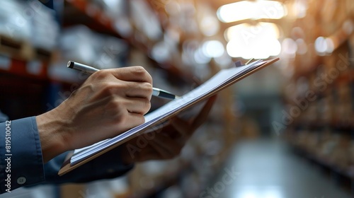 Close-up of a hand holding a pen and clipboard checking inventory in a warehouse representing logistics and supply chain management.