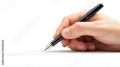 Close-up of a hand holding a sleek black fountain pen, poised to write on a blank sheet of paper, symbolizing creativity and elegance.