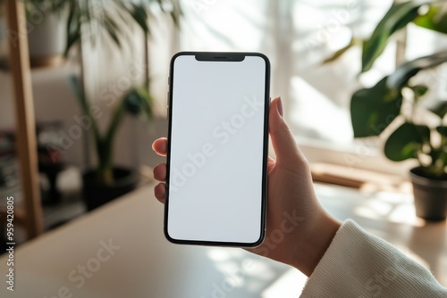Closeup of a hand holding a smartphone with a blank screen, with plants and a window in the background.