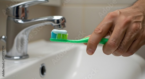 Close-up of a hand holding a toothbrush with toothpaste in front of a sink, concept of morning routine, dental hygiene, and self-care.