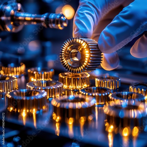 Close-up of a hand in a glove holding a golden gear amid a collection of gears, illuminated by blue light, showcasing precision engineering in a modern industrial setting.