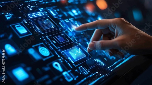 Close-up of a hand interacting with a digital interface, with a blue glowing screen.