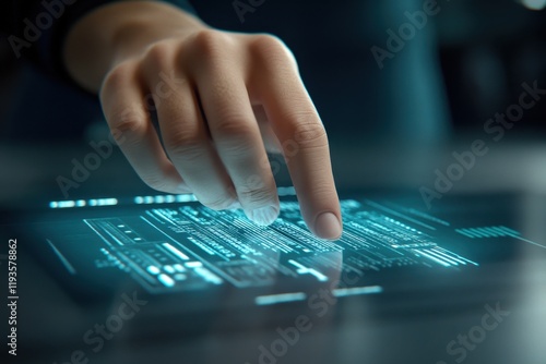 Close-up of a hand interacting with a glowing futuristic touchscreen, showcasing advanced technology and digital interface design.