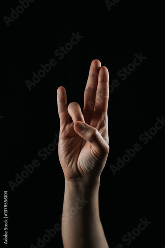 Close-up of a hand making a unique finger gesture on a black background. Symbolic or expressive sign, ideal for communication, creativity, or cultural context concepts.