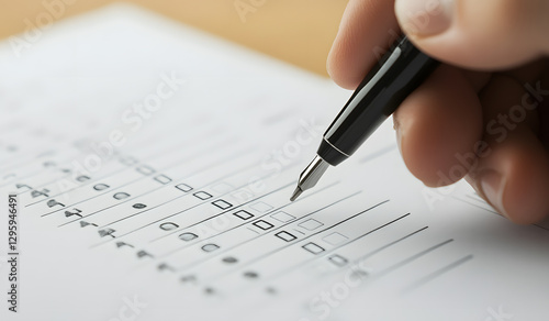 Close-up of a hand marking a checklist with a fountain pen on a wooden table