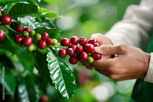 Close-up of a hand picking ripe coffee cherries from a coffee plant.