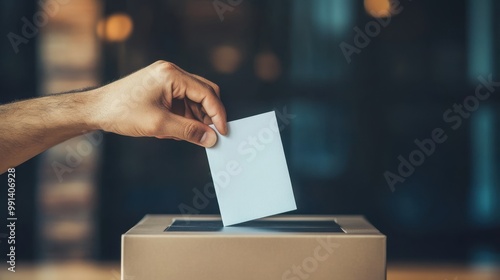 Close-up of a hand placing a ballot into a sleek modern box emphasizing democratic participation and choice