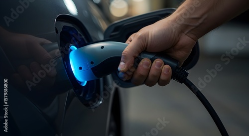 Close-Up of a Hand Plugging in an Electric Vehicle Charger with a Soft Blue Glow in a Modern Urban Setting