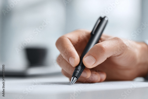 Closeup of a hand signing a document with a pen. Symbolizes agreement, signature, or writing. Great for business, contracts, or legal concepts. Focus on detail and importance.
