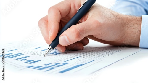Close-up of a hand writing on financial documents with a pen, isolated on white background.