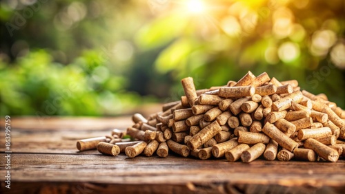 Close-up of a handful of wood pellets on a rustic wooden table with a blurred background and copy space available.