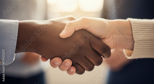Close-up of a handshake between a person with dark skin and a person with light skin, symbolizing agreement and partnership.