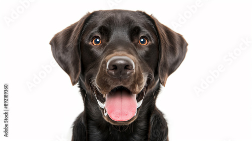 Close-up of a happy black Labrador Retriever with a joyful expression and a big smile on a white background.