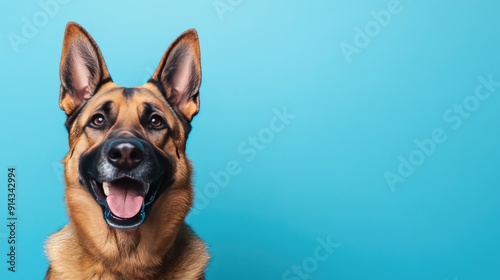 Close-up of a happy German Shepherd dog with a blue background, providing clear space for text or branding.