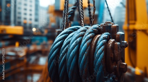 Close-up of a heavy duty blue metal cable coiled on a construction site in an urban setting