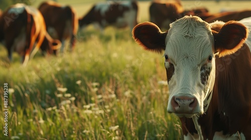 Closeup of a herd of Hereford cattle grazing in a Saskatchewan pasture : Generative AI