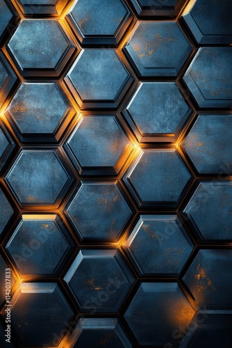 Close-up of a hexagonal tiled wall with glowing edges, showcasing a sleek metallic finish and modern design.