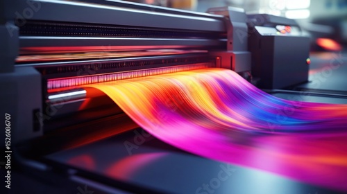 Close-up of a high-quality large format printer producing vibrant, colorful prints with smooth gradients, showcasing advanced digital printing technology indoors