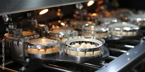 Close-up of a high-tech automated manufacturing process with small, round objects being processed on a conveyor belt