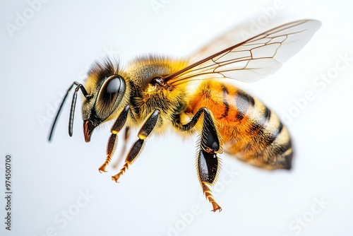 closeup of a honey bee in midflight wings spread with intricate details of its fuzzy body and compound eyes visible against a pure white backdrop