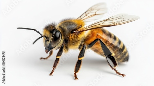 Close-up of a honeybee in profile view against a white background.