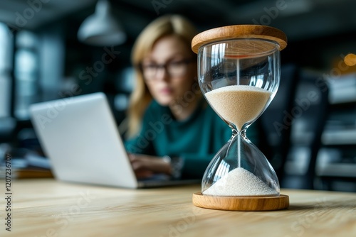 Close-up of a hourglass measuring time on a wooden office table, with an Indian businesswoman working in the background, symbolizing efficiency and deadline management, showcasing time management