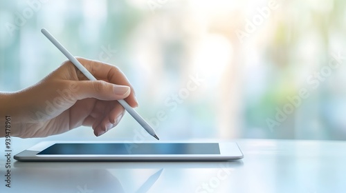 Closeup of a human hand holding a stylus hovering over a digital tablet device isolated against a light and minimalist background with ample blank copy space on the left side