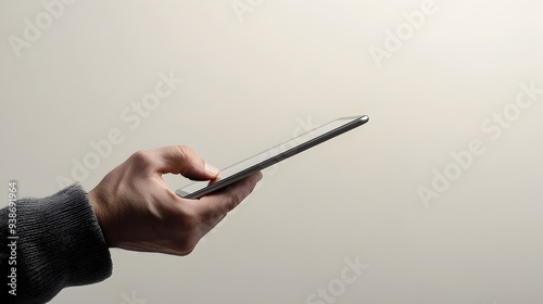 Closeup of a human hand holding a stylus or digital pen hovering over the surface of a blank isolated digital tablet or graphics pad against a simple