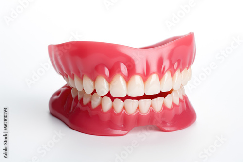 Close-up of a jaw prosthesis or false jaw on a white plain background