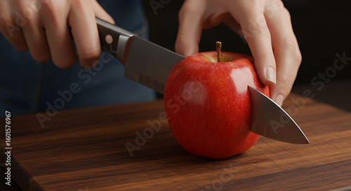 Close-up of a knife cutting a bright red apple on a dark wooden cutting board, hand holding the apple, highly realistic, perfect focus on the bright apple and metallic knife blade