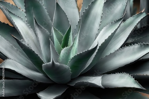 Close-up of a large agave plant with thick, pointed blue-green leaves featuring sharp serrated edges radiating from the center