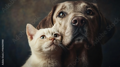 Close-up of a Large Dog and Small Cat Sitting together Against Dark Background Showing Friendship Bond and Pet Companionship in a Home Setting Image