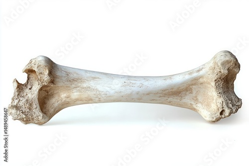 Close-up of a large femur bone isolated on white background showing texture and natural coloration