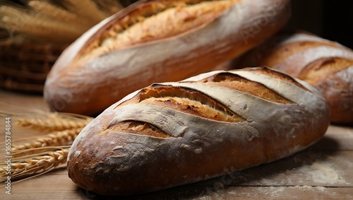 Close-up of a large golden artisan bread loaf with detailed scoring and flour dusting on rustic wood.