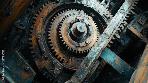 Close-up of a large, rusted gear mechanism in an industrial setting.