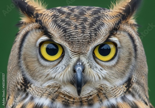 Closeup of a Large Yellow-eyed Owl with Detailed Feather Patterns and Intense Gaze in Natural Setting
